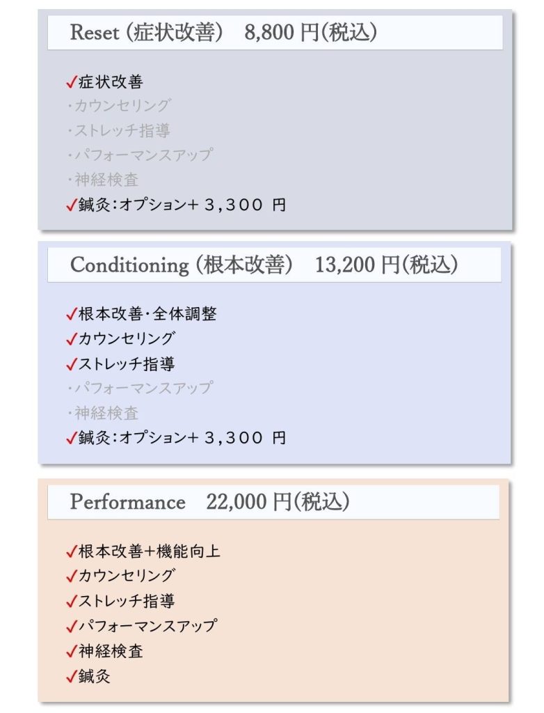 そこで今回、これまで大切にしてきた『全体を丁寧に整える施術』はそのままに、お身体の状態や目的に応じて、より適切な施術を選んでいただきやすい形へ、施術メニューを見直しました。