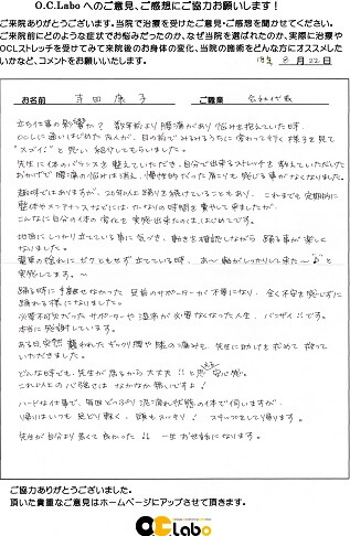 立ち仕事の影響か?数年前より腰痛があり悩みを抱えていた時、O.C.Laboに通い始めた友人が目の前でみるみるうちに変わって行く様子を見て“スゴイ!”と思い紹介してもらいました。