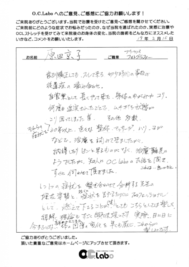 それらの症状を30年以上、色々な整体・マッサージ・鍼・ヨガなどで治療を試みて来ましたが、納得したりピンとくるものがなく、治療難民のようでしたが、知人にO.C.Laboのお話を聞きこれは良いかもとすぐに伺わせて頂きました。